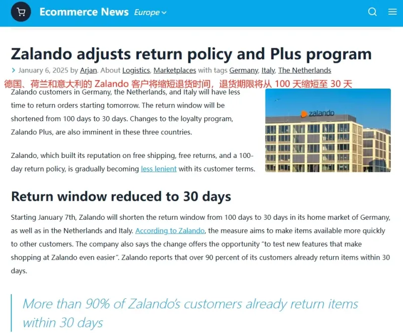 除了借助AI技術緩解退貨率外,Zalando還從退貨政策上入手了。今年1月,Zalando宣布,德國、荷蘭、意大利這三大市場的退貨期間將從100天縮短至30天,以此提高商品周轉效率,讓更多客戶更快獲得心儀商品。