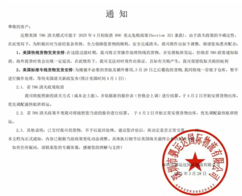 此外,各大市場的政策環(huán)境變化,也會對跨境航運(yùn)產(chǎn)生影響。例如,近期由于有傳言稱,美國很有可能在4月2日簽署取消T86清關(guān)政策的行政令,導(dǎo)致大批跨境物流服務(wù)商人心惶惶,紛紛發(fā)布緊急通知,宣布暫停發(fā)貨直至美國清關(guān)新政發(fā)布。