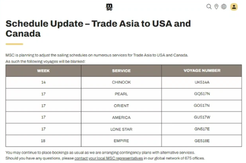 具體來說,從第14周(3月31日至4月6日)至第18周(4月28日至5月4日),MSC將陸續(xù)取消Chinook航線的UK514A航次、Pearl航線的GQ517N航次、Orient航線的GO517N航次、America航線的GU517W航次、Lone Star航線的GN517E航次以及Empire航線的GE518E航次,其中大部分航次連接的是亞洲與美國。