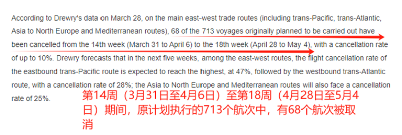 更糟糕的是,停航已成為各大船運(yùn)公司應(yīng)對運(yùn)價(jià)下滑的主要手段。德路理的數(shù)據(jù)就指出,第14周至第18周,東西主要貿(mào)易航線原計(jì)劃執(zhí)行的713個(gè)航次中,已有68個(gè)被取消。預(yù)測未來五周內(nèi),跨太平洋東行航線的航班取消率預(yù)計(jì)將達(dá)到最高,為47%。