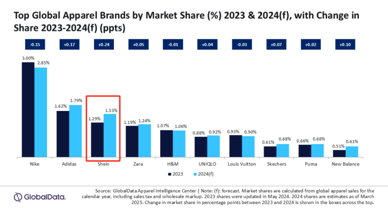 隨著電商渠道的迅猛發展,快時尚行業的競爭格局發生了翻天覆地的變化。以SHEIN、Temu為代表的新興電商平臺憑借低成本和快速響應的供應鏈,提供了極具價格競爭力的產品,逐漸蠶食了Forever 21等傳統快時尚品牌的市場份額。國際咨詢機構GlobalData發布數據顯示,SHEIN已經躋身全球前三時尚零售商。