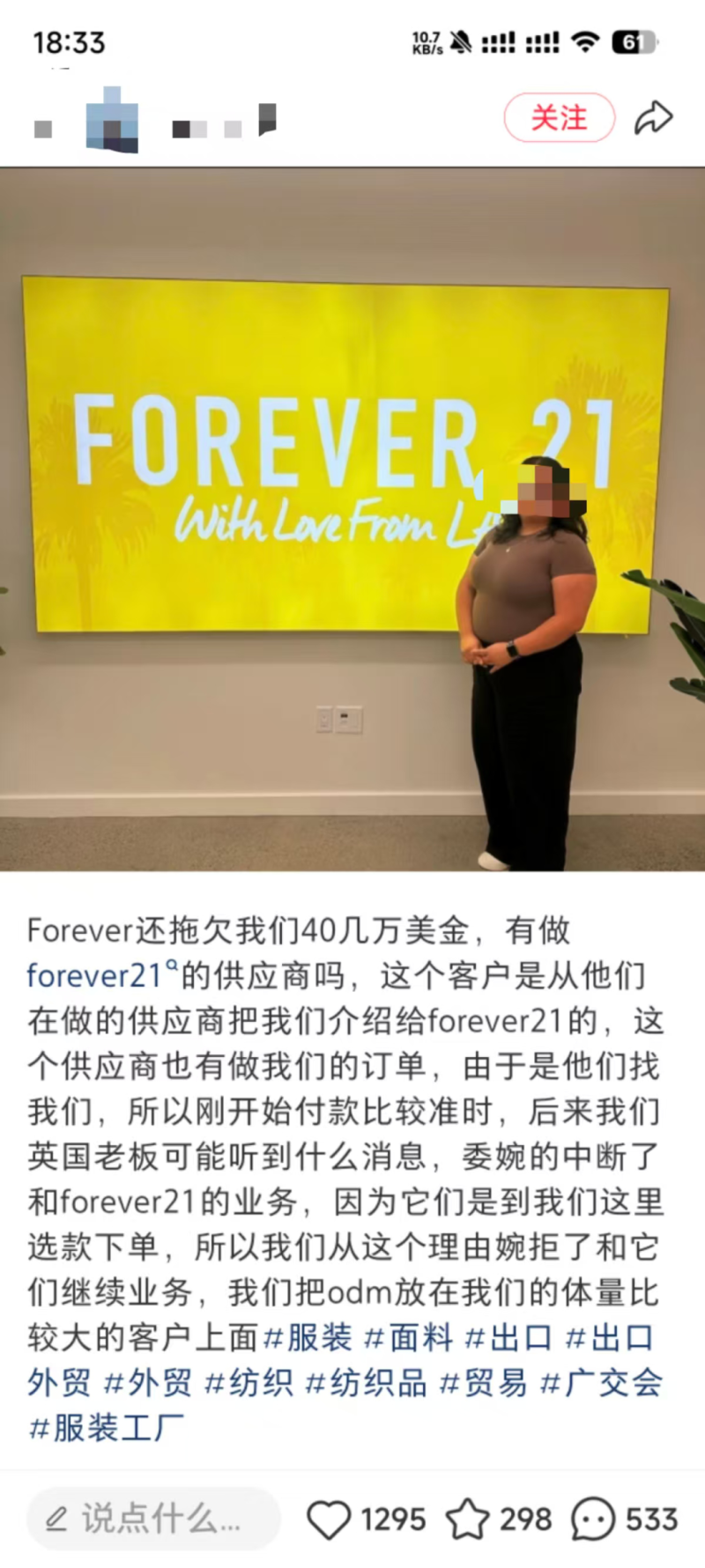 值得一提的是,Forever 21的困境不僅對自身造成了巨大影響,也讓消費者失去了一個“心頭好”,更讓眾多供應商陷入了前所未有的困境,甚至有供應商被Forever 21拖欠了400多萬美元,而這些款項原本是他們用于維持正常運營和支付員工工資的重要資金來源。