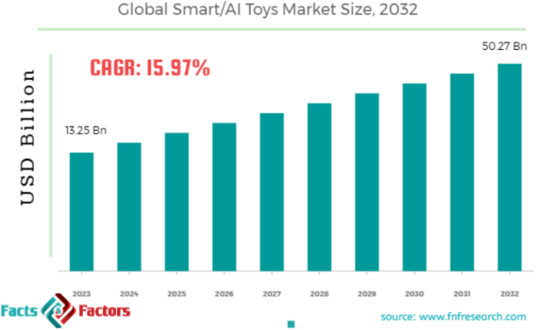 AI玩具的火爆并非偶然。據(jù)Facts Factors發(fā)布的數(shù)據(jù),2023年全球AI玩具市場(chǎng)規(guī)模已經(jīng)達(dá)到132.5億美元,這一數(shù)字到2032年有望超過(guò)502.7億美元將超過(guò)300億元,預(yù)計(jì)2024年至2032年期間復(fù)合年增長(zhǎng)率為15.97%。這一數(shù)據(jù)并不夸張,2025年以來(lái),AI玩具的市場(chǎng)需求進(jìn)入了爆發(fā)階段,許多工廠訂單接到手軟,加班加點(diǎn)趕生產(chǎn)。