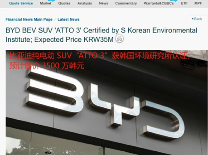 今年年初,韓國環境部就發出消息稱,比亞迪旗下純電SUV車型“ATTO 3”(中國命名為PLUS)已獲國立環境科學院頒發的尾氣排放及噪音認證,或將成為首款在韓上市的車系。另有消息稱,比亞迪計劃2025年在韓國市場賣出1萬輛汽車。