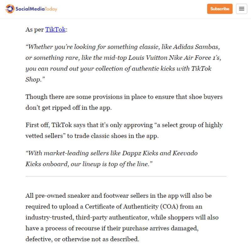 TikTok表示,用戶現在可以在觀看關于經典球鞋的視頻后,直接跳轉到應用內的購買頁面完成交易。無論是阿迪達斯Sambas等經典款,還是路易威登與耐克聯名的Air Force 1限量款,用戶都能在TikTok Shop中找到經過認證的正品球鞋。