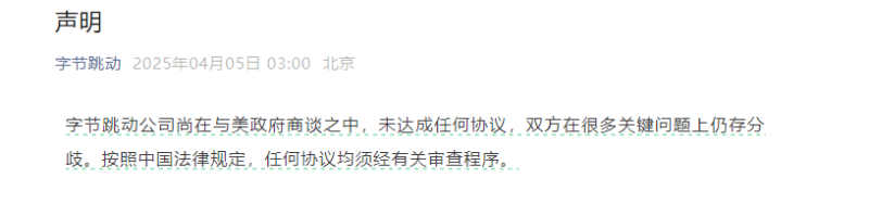 4月5日凌晨,字節(jié)跳動也發(fā)布聲明稱,字節(jié)跳動公司尚在與美政府商談之中,未達(dá)成任何協(xié)議,雙方在很多關(guān)鍵問題上仍存分歧。按照中國法律規(guī)定,任何協(xié)議均須經(jīng)有關(guān)審查程序。