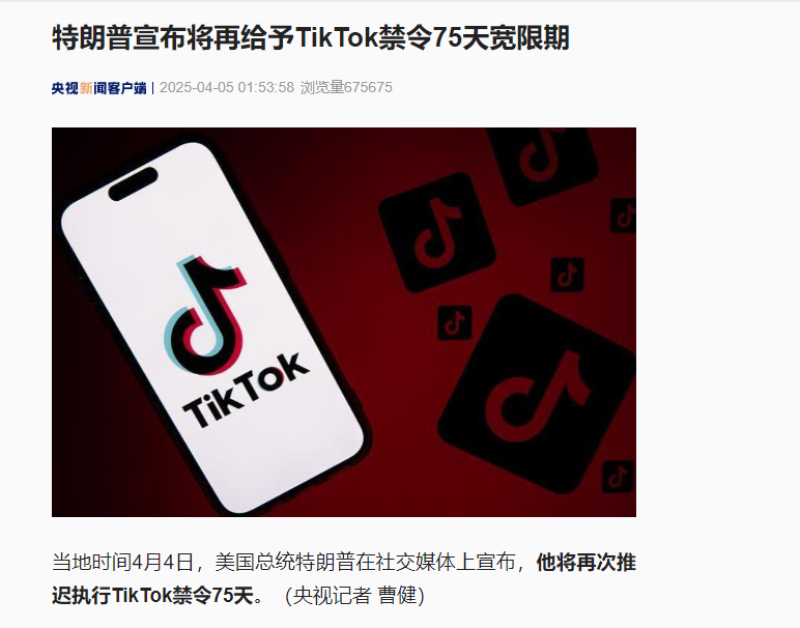 美國總統(tǒng)特朗普于當(dāng)?shù)貢r間4月4日宣布,將再次推遲執(zhí)行TikTok禁令75天。
