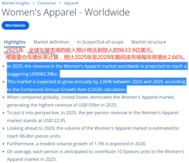 根據Internet Retailing發布的《2023年全球時尚電商報告》顯示,2022年全球時尚電商的銷售總額為8630億美元,其中,服裝品類的銷售額比配飾高出近2倍,比鞋類高出近4倍,且女裝占服裝銷售額的五成。無獨有偶,Statista的數據也表明跨境女裝賽道仍存紅利,預計該市場的收入在2025年能夠達到驚人的9633.9億美元,2025年-2029年期間的復合年增長率為2.66%。