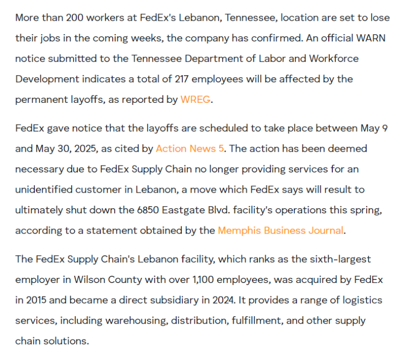 作為該計劃的一環,聯邦快遞已在田納西州、伊利諾伊州、弗吉尼亞州和西弗吉尼亞州關閉了多個運輸中心,并裁減了部分員工。此次在田納西州的裁員和業務縮減,反映出其在北美市場的進一步調整。盡管公司尚未公布具體的補償方案或安置計劃,但預計受影響的員工將獲得一定程度的經濟補償和職業過渡支持。