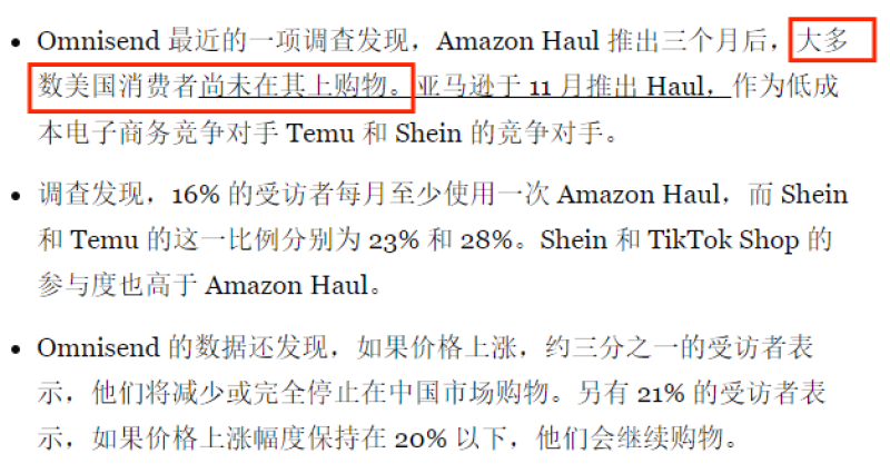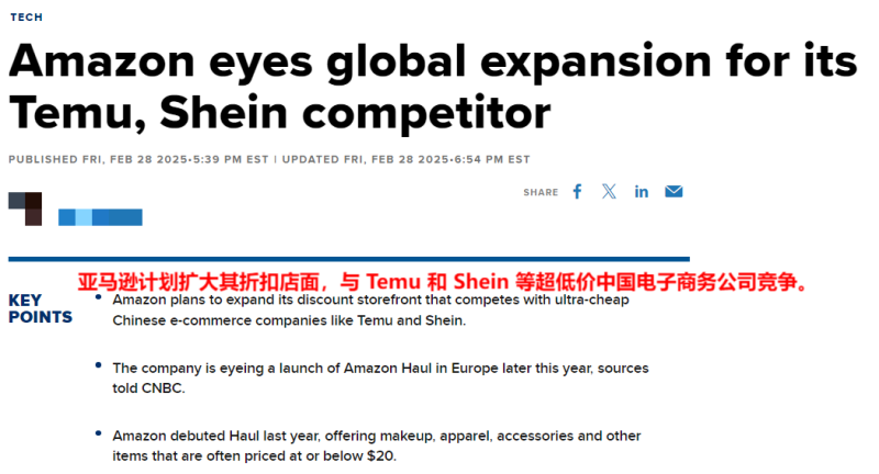 比如去年底,亞馬遜上線低價(jià)商城Amazon Haul,與Temu直面競(jìng)爭(zhēng)下沉市場(chǎng)份額。雖然到目前為止,Amazon Haul尚未取得突出的市場(chǎng)成果,而此時(shí)又恰逢關(guān)稅政策變化,但亞馬遜絲毫沒有退縮的跡象,反而對(duì)Amazon Haul滿懷信心。