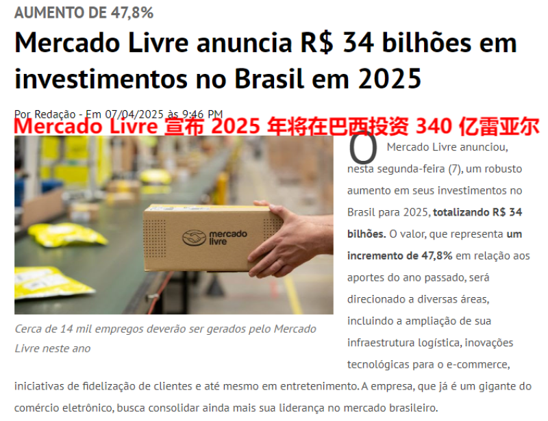 近日,巴西總統在美客多位于圣保羅的一項物流活動中透露,美客多將在今年內向巴西市場投資340億雷亞爾(約合58億美元),用于加強其電商和金融業務、擴大物流基礎設施及分銷網絡。