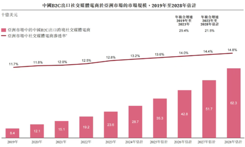 近年來,由于互聯網普及率的提升、社會經濟的不斷發展以及中國跨境供應鏈的持續完善,在亞洲(不包括中國)向消費者銷售產品的中國B2C出口社交媒體電商業務增長勢頭強勢,市場規模從2019年的84億美元增長至2023年的236億美元,復合年增長率達到29.4%;預計到2028年,該數值還將增長至623億美元,增速達到21.5%。