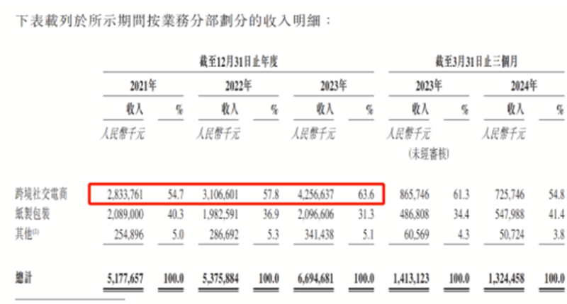 靠社交媒體獲取海外流量,吉宏股份這招確實十分有效,2021年-2023年,跨境社交電商業務為吉宏股份貢獻的營收從28.37億元增長至42.57億,占總收入的比例從54.7%上升至63.7%,毛利率超過60%。