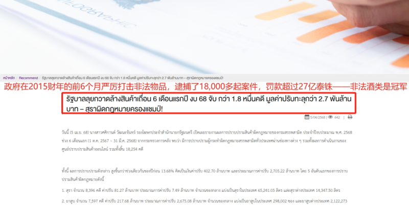 詳細來說,這些案件包括了在線商品打擊中心處理的案例,共涉及罰款金額達4.027億泰銖,預計的罰款總額更是超27億泰銖,相當驚人的數字。在所有假冒違法商品中,從具體的品類來看,酒類、煙草、油及油制品、摩托車以及撲克牌是“重災區”。