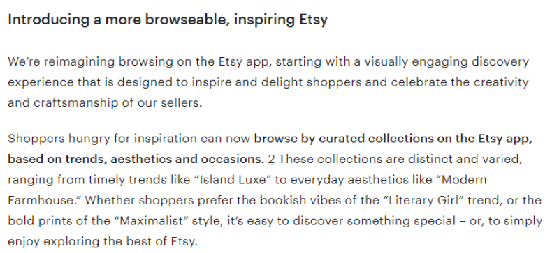 這一方式被Etsy稱為“算法式策展”,融合了人工策展的靈感與AI的擴展能力。在呈現給用戶的過程中,系統會結合其瀏覽與購買行為,動態調整系列順序與重點推薦內容,以實現更精準的個性化推送。