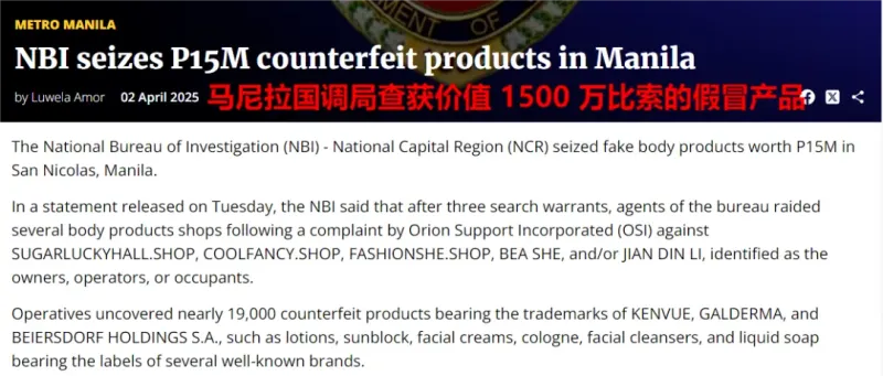 本月初,菲律賓國家調查局(NBI)在馬尼拉市搗毀了一處銷售假冒護膚品的倉庫,包括妮維雅、強生嬰兒等知名品牌,此次共繳獲高達18889件假冒護膚品,總價值約1500萬比索(約合人民幣190萬元)。