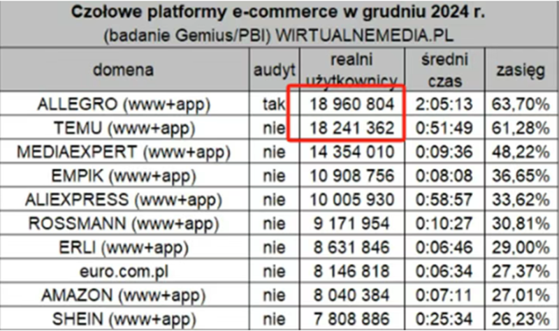 而根據(jù)Mediapanel發(fā)布的波蘭電商平臺(tái)研究報(bào)告,2023年12月,Allegro平臺(tái)月訪(fǎng)問(wèn)量比Temu高出570萬(wàn),競(jìng)爭(zhēng)優(yōu)勢(shì)明顯,然而到了2024年12月,這一差距已經(jīng)縮小到72萬(wàn)。