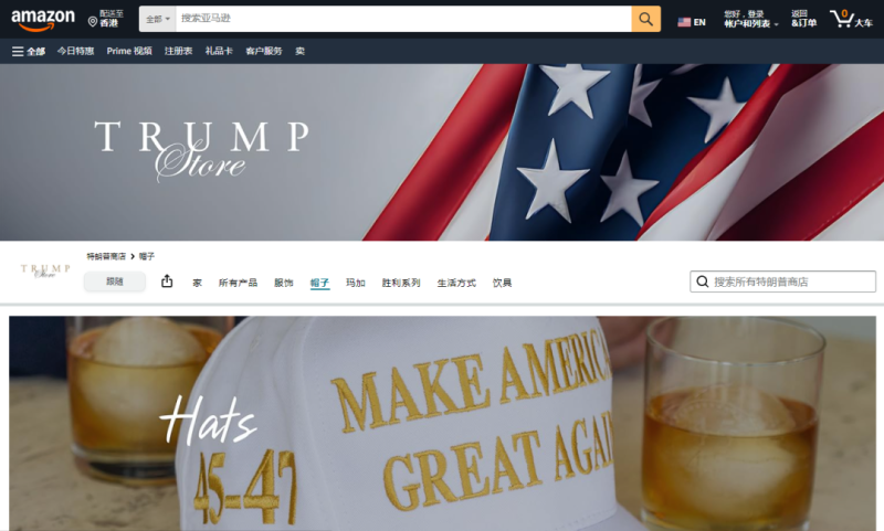 打開亞馬遜的官方購物網站,輸入關鍵詞“trump”,竟然彈出了一個名為“Trump Store”的店鋪頁面,并且被標注為“特朗普組織的官方零售店鋪”。進入店鋪主頁可以看到,該店鋪上架的商品種類豐富,多達54款,涵蓋了帽子、T恤、馬克杯、旗幟等多個品類,售價還不便宜。