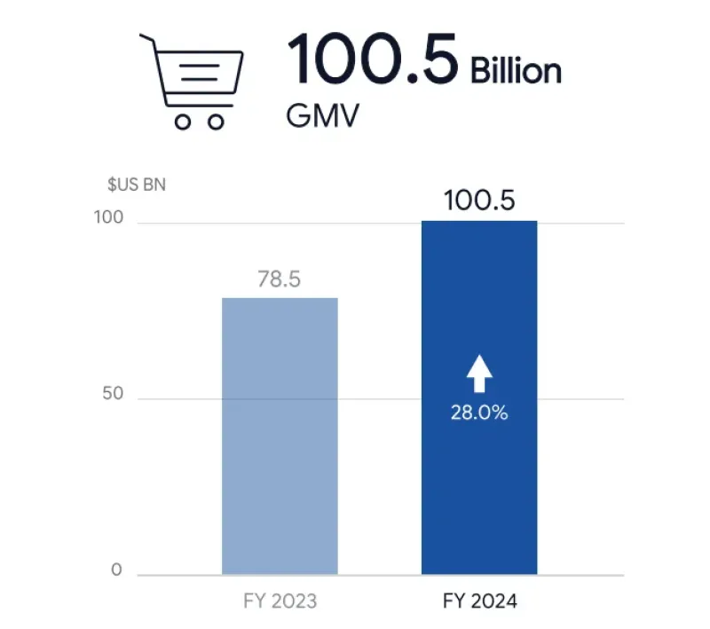 根據Shopee公布的財報,2024年Shopee GMV同比增長28%,強勢突破1000億美元(1005億美元)大關,訂單量超過100億;營收達到124億美元,撐起了母公司Sea的大半邊天(總營收168億美元)。