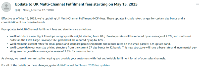 4月15日消息,亞馬遜英國站發(fā)布公告,對多渠道配送(MCF)費用進(jìn)行更新。這些更新包括調(diào)整部分尺寸的費率,并整合超大尺寸的商品。自2025年5月15日起,亞馬遜英國站點MCF費用和尺寸等級的主要更新如下: