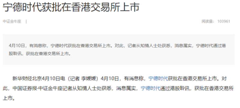 寧德時代獲批在香港交易所上市 圖源:中國金融信息網