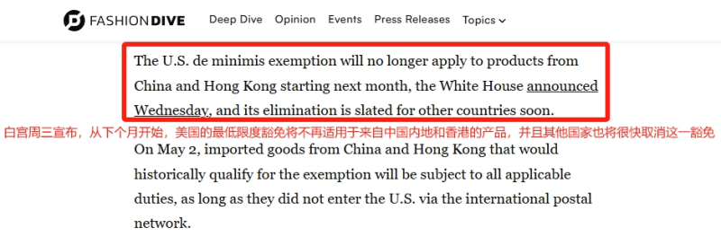 4月初特朗普就簽署行政令,正式宣布自美國東部時間5月2日起,通過國際郵政網絡方式寄往美國的產品,若價值等于或低于800美元,并且符合最低限度豁免的條件,需征收占產品價值30%或每件25美元(自2025年6月1日起,增加至50美元)的關稅。