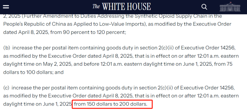 根據白宮最新公告,特朗普簽署的《修改互惠關稅稅率以反映貿易伙伴的報復和協調》中提出,對來自中國大陸及香港、且貨值不超過800美元的包裹,2025年5月2日后(美國東部夏令時間,下同),每件包裹將征收其貨值的120%或每件100美元的關稅(此前為90%或75美元)。自6月1日起,該標準將進一步上調至每件200美元(此前為150美元)。