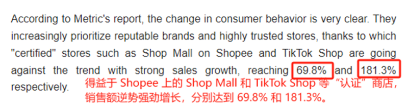 可以看到,充斥在直播市場的虛假廣告和劣質商品正在不斷侵蝕消費者對主播的信任,比起在直播間中購買質量不確認的低價產品,東南亞人更傾向于在品牌官網或者好評率高的店鋪進行購買。Metric的數據佐證了這一趨勢:Shopee Mall和TikTok Shop上的已認證店鋪近期銷量逆勢上揚,分別增長69.8%和181.3%。