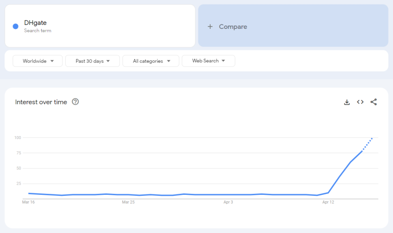 谷歌趨勢顯示,4月12日之后,“DHgate”的搜索量陡然升高。4月12日,在蘋果和谷歌應用商店,DHgate總下載量3.54萬次,到4月13日,單日下載量暴漲至11.75萬次,其中僅蘋果商店,美國用戶就貢獻了6.51萬次下載量,環比增長940%。