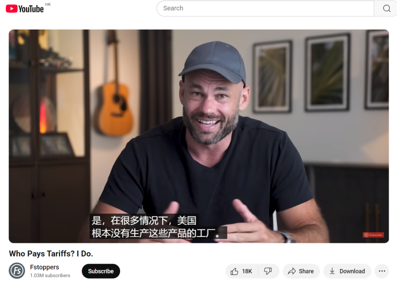 油管上,一位百萬博主@Fstoppers給出了答案,這位博主發布了一條視頻,題為“誰支付關稅?我!”。這位博主介紹,他本身在美國賣辣椒醬,作為美國公民,他很愿意為美國制造支付溢價,但現實是美國工廠要么沒能力生產,要么報價高到沒有任何合作的可能性。