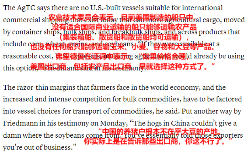 甚至連美國農民也難逃其害。美國農業技術委員會表示,目前美國制造的船只中,根本沒有適合運輸農產品的國際商業運輸船,就算有,價格也不合理。