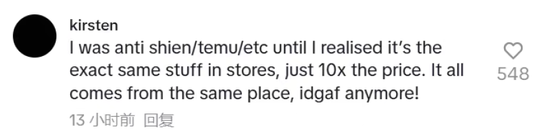 “我本來很討厭shein和temu之類的地方,直到我發現它們的東西和商店里的一模一樣,但商店價格卻貴了10倍。我再也不在乎了!它們都來自同一個地方。”