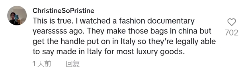 “這是真的。我幾年前看過一部時尚紀錄片。那些奢侈品包都在中國生產,但把手在意大利裝上,所以大多數奢侈品都能合法地宣稱是意大利制造。”