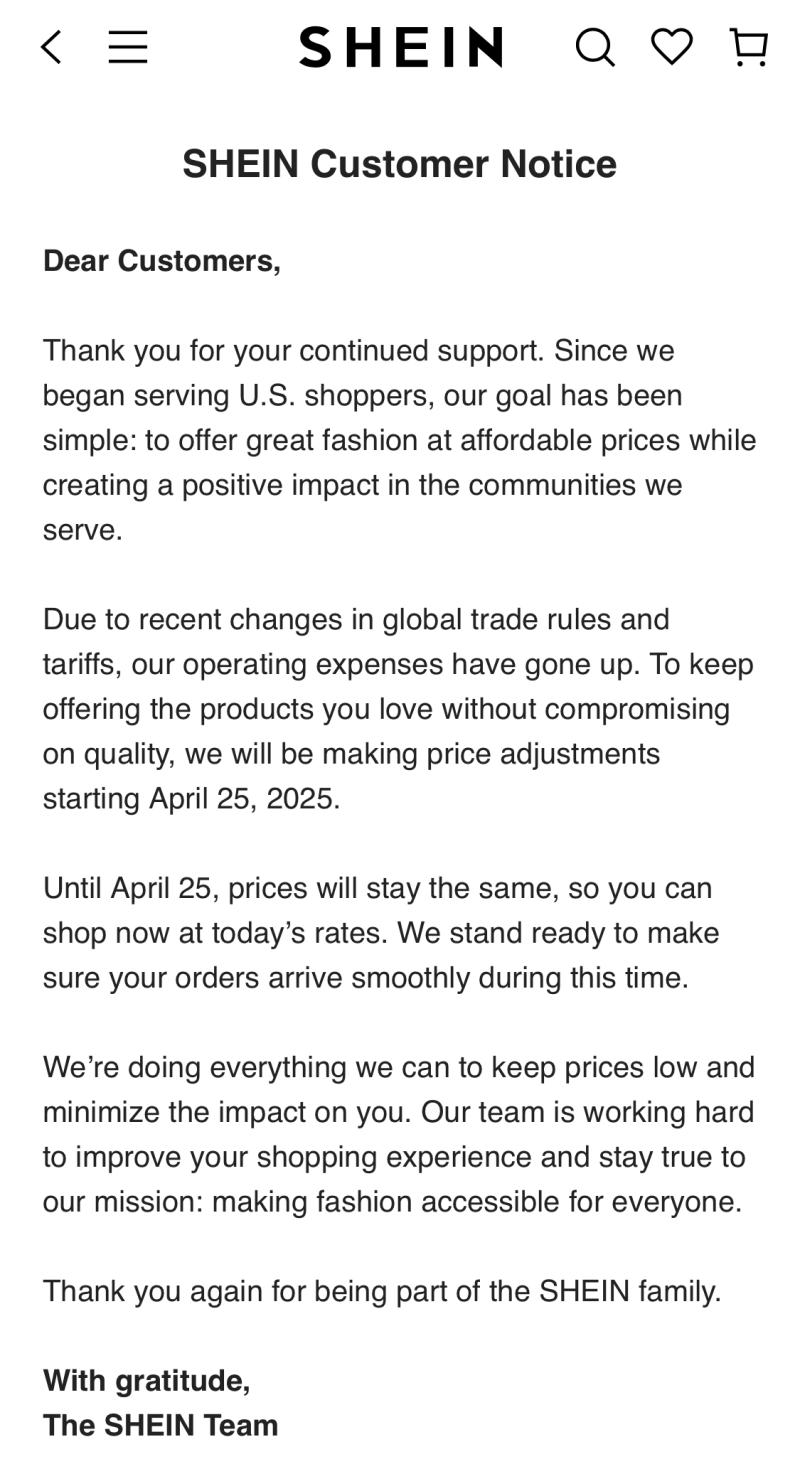 SHEIN客戶通知顯示:由于最近全球貿易規則和關稅的變化,我們的運營費用有所增加。為了在不犧牲質量的情況下繼續提供您喜歡的產品,我們將從2025年4月25日開始進行價格調整。在4月25日之前,價格將保持不變,因此您現在可以按今天的價格購物,我們隨時準備確保您的訂單在此期間順利送達。我們正在盡一切努力保持低價,盡量減少對消費者的影響。