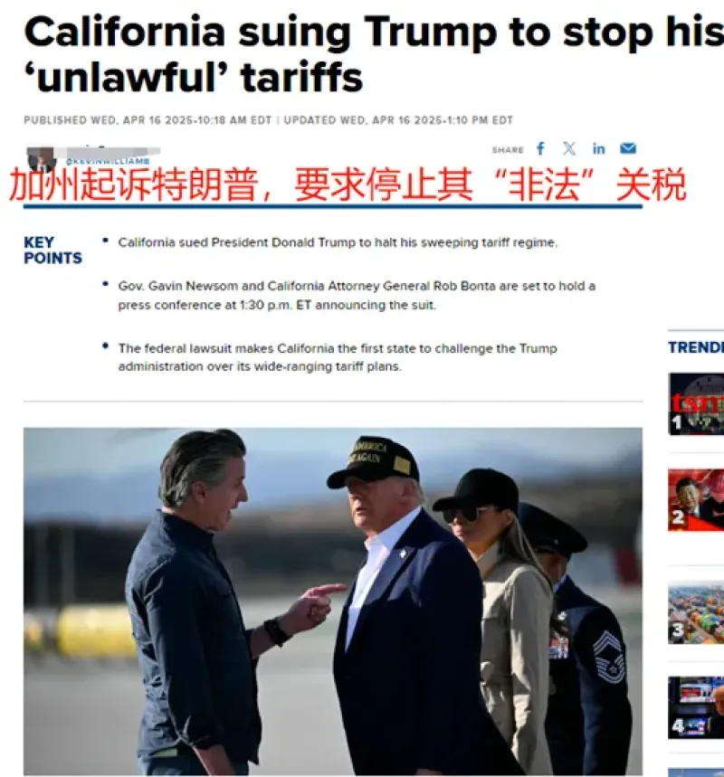 近日,加利福尼亞州州長(zhǎng)Gavin Newsom就關(guān)稅問(wèn)題起訴特朗普政府,要求宣布特朗普關(guān)稅政策無(wú)效,同時(shí)直言這樣加稅是“非法且史無(wú)前例的”。根據(jù)Newsom辦公室的總結(jié),關(guān)稅給加州這個(gè)全美最大的經(jīng)濟(jì)、制造業(yè)和農(nóng)業(yè)州造成了直接且不可挽回的傷害。