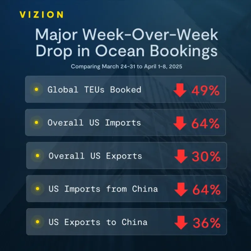 根據(jù)貨運(yùn)數(shù)據(jù)公司Vizion最新發(fā)布的報(bào)告《關(guān)稅沖擊波》,隨著關(guān)稅政策的不確定加劇,與今年3月24日至31日這一周相比,4月1日至8日期間,美國(guó)進(jìn)口訂單量暴跌64%,來(lái)自中國(guó)的預(yù)訂量也下跌36%。