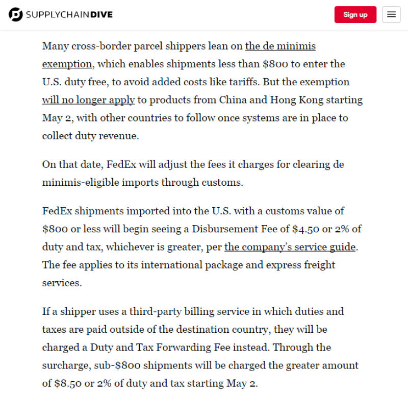5月2日起,800美元以下小額包裹免稅政策將不再適用于來自中國內地和香港的產品,聯邦快遞也將從那天起調整符合最低限度條件的進口商品的海關清關費用。