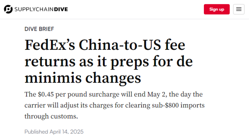 與此同時,聯邦快遞也對來自中國大陸、中國香港和菲律賓的進口包裹加收每磅0.45美元的附加費,每件包裹最低收費1美元。此次加費預計持續至5月2日,即取消對800美元以下商品免稅待遇的正式生效日期。聯邦快遞上一輪類似附加費于2023年9月至2024年1月實施,當時的費率為每磅1美元。