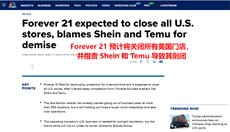 不過(guò),眼下美國(guó)計(jì)劃取消T86政策,并加征關(guān)稅,Shein和Temu也計(jì)劃將提高美國(guó)商品價(jià)格,F(xiàn)orever 21指出的市場(chǎng)競(jìng)爭(zhēng)或許將有所轉(zhuǎn)變。