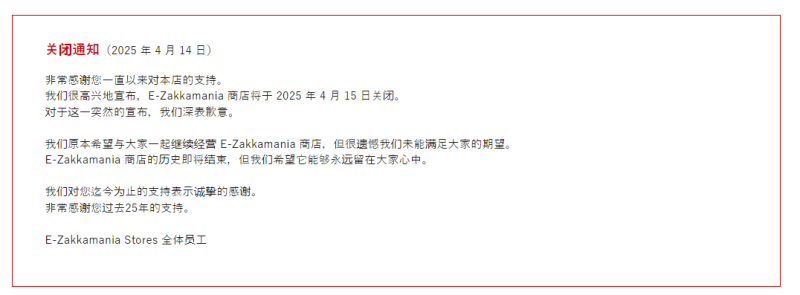 E-Zakkamania Stores關(guān)店 圖源:e-zakkamania