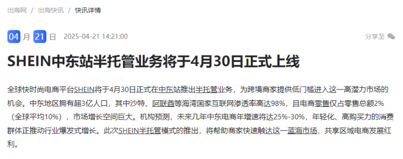 4月22日消息,SHEIN中東站即將上線半托管業務,上線時間定為4月30日。中東地區擁有超3億人口,其中沙特、阿聯酋等海灣國家互聯網滲透率高達98%,且電商零售僅占零售總額2%(全球平均10%),市場增長空間巨大。機構預測,未來幾年中東電商年增速將達25%-30%,年輕化、高購買力的消費群體正推動行業爆發式增長。此次SHEIN半托管模式的推出,將幫助商家快速觸達這一藍海市場,共享區域電商發展紅利。