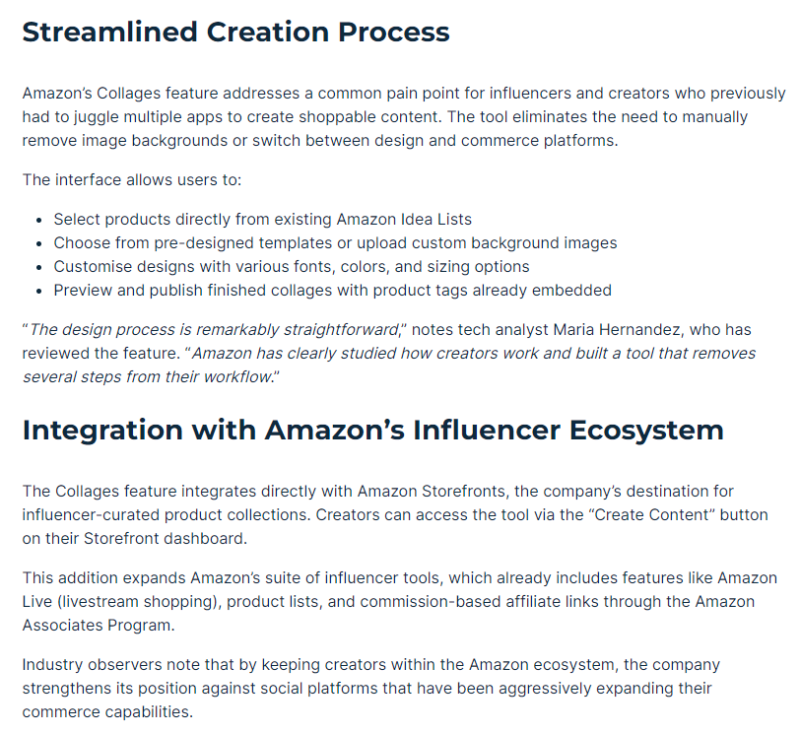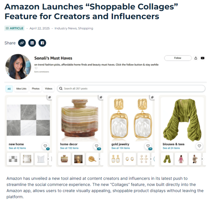 對于依賴亞馬遜聯(lián)盟計劃實現(xiàn)內(nèi)容變現(xiàn)的創(chuàng)作者而言,拼貼功能預(yù)計將帶來更高的點擊轉(zhuǎn)化率。與傳統(tǒng)產(chǎn)品鏈接或圖片分享相比,拼貼圖因其可視化和可操作性更強(qiáng),有助于引導(dǎo)消費者快速做出購買決策,提升創(chuàng)作者收入。在Instagram和TikTok Shop等平臺爭奪創(chuàng)作者關(guān)注度的背景下,亞馬遜正通過降低技術(shù)門檻和增強(qiáng)工具易用性,穩(wěn)步擴(kuò)大其對創(chuàng)作者經(jīng)濟(jì)的吸引力。