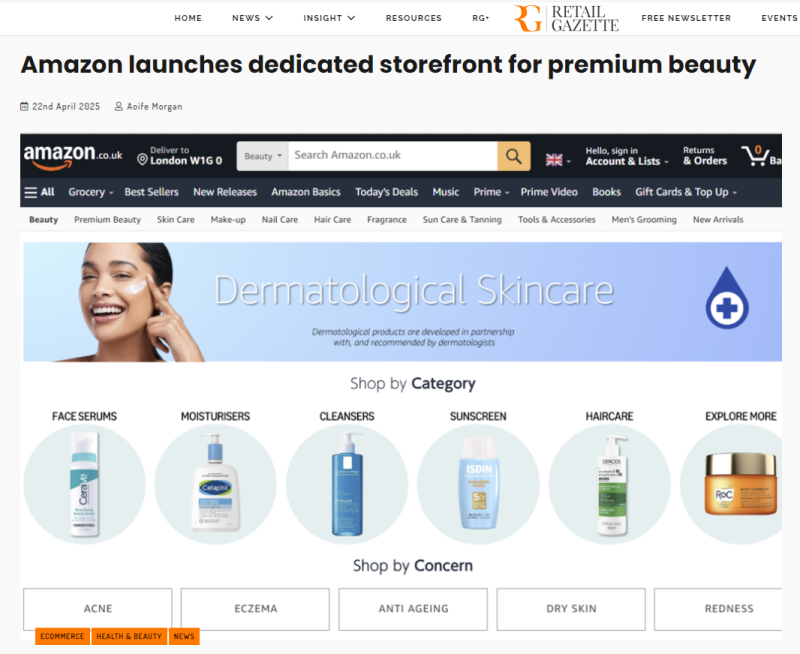 4月23日消息,亞馬遜在歐洲及英國市場推出專屬的“醫(yī)學(xué)護(hù)膚”與高端美妝專區(qū),進(jìn)一步擴(kuò)展其在美容領(lǐng)域的布局。這一新類別主要面向?qū)︶t(yī)學(xué)護(hù)膚產(chǎn)品有明確需求的消費(fèi)者,強(qiáng)調(diào)通過膚質(zhì)、成分及品牌等維度實(shí)現(xiàn)精準(zhǔn)選品。通過設(shè)立專門的線上專區(qū),亞馬遜為用戶提供如Caudalie、La Roche-Posay和Dermalogica等知名品牌的護(hù)膚產(chǎn)品,并配備完善的篩選工具和信息支持,打造結(jié)構(gòu)化、個(gè)性化的購物體驗(yàn)。