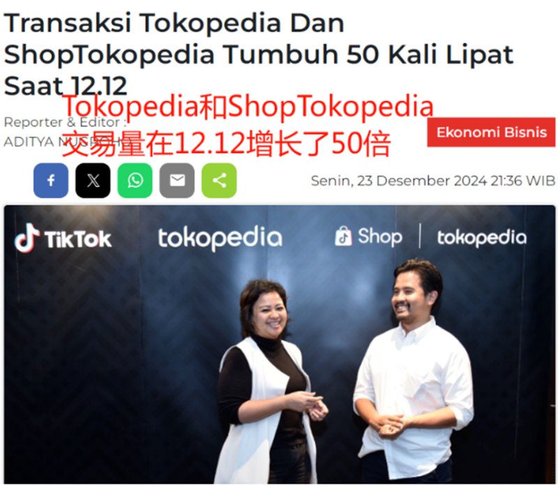 去年雙十二活動(dòng)期間,TikTok和Tokopedia業(yè)務(wù)合并后的平臺(tái)Shop Tokopedia就通過(guò)TikTok直播功能實(shí)現(xiàn)交易額激增目標(biāo),Tokopedia與TikTok電子商務(wù)通訊主管Aditia Grasio Nelwan表示,平臺(tái)交易額在雙12高峰期第一個(gè)小時(shí)內(nèi)較平日激增近50倍,體現(xiàn)了強(qiáng)烈的用戶參與度和高漲的消費(fèi)熱情。