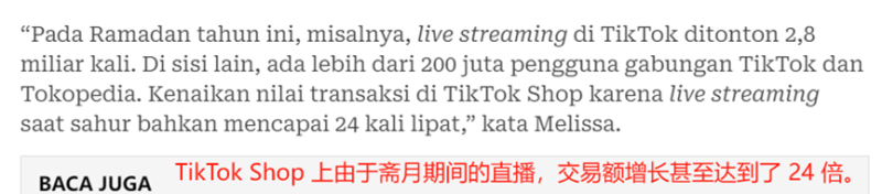 此外,3份月印尼齋月節(jié)大促也給平臺(tái)賣(mài)家業(yè)務(wù)增長(zhǎng)提供了契機(jī),Melissa指出,今年齋月期間,TikTok上的直播觀看次數(shù)達(dá)到28億次,由于齋月期間的直播,TikTok Shop交易額增長(zhǎng)甚至達(dá)到24倍。此外,目前TikTok和Tokopedia的用戶總數(shù)已超過(guò)2億。