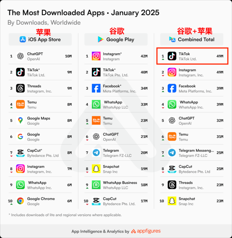 TikTok 1月下載量全球第一 圖源:AppFigures