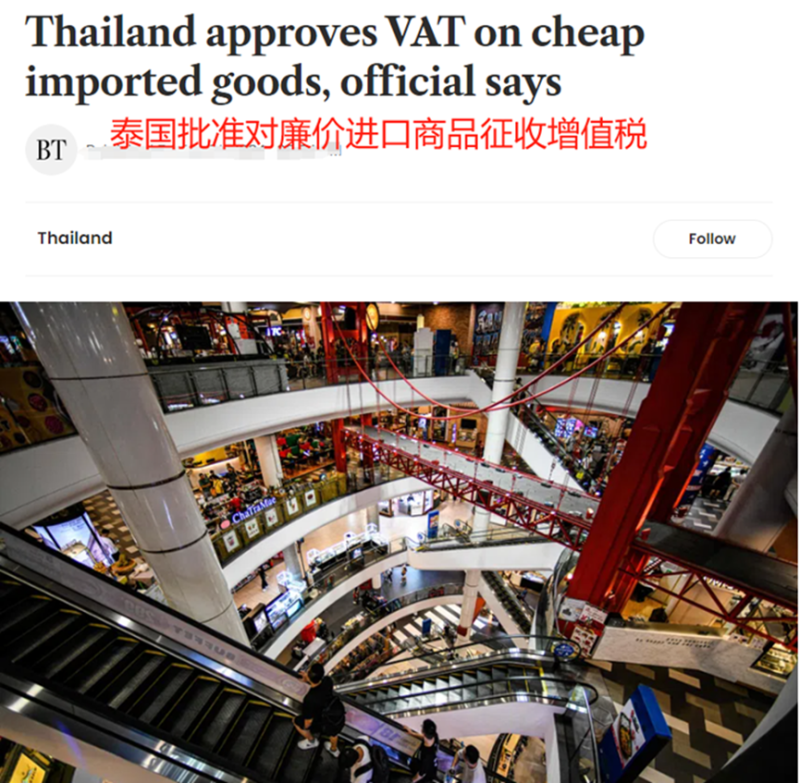 同年7月,泰國財務部長正式簽署公告,批準取消針對售價低于1500泰銖的進口商品的免稅政策,從2024年7月5日起,所有運輸往泰國境內的低價進口商品都需繳納7%的增值稅。