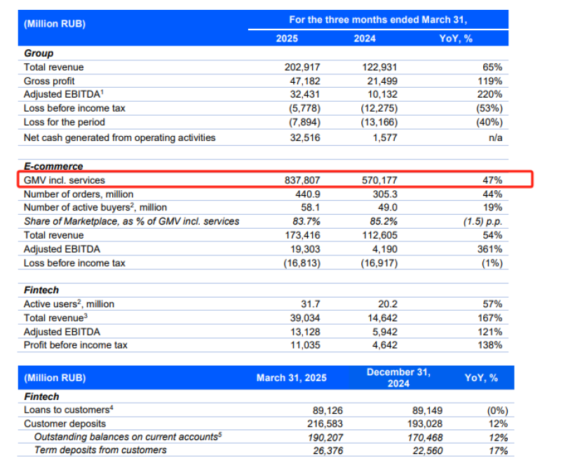 電商方面,包含服務(wù)在內(nèi)的商品交易總額(GMV)同比增長47%,達到8378億盧布,主要得益于訂單數(shù)量的增長。電子商務(wù)收入同比增長54%至1734億盧布。截至2025年第一季度末,活躍買家數(shù)量同比增長900萬,達到5800多萬,訂單頻率超過每年27筆,而2024年第一季度為22筆。