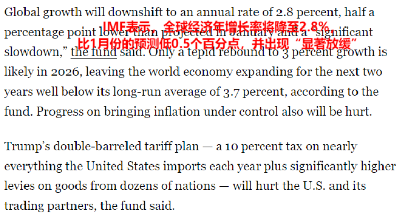 另外,國際貨幣基金組織(IMF)表示,受特朗普征收影響,今年全球經濟增長將大幅放緩,美國經濟放緩將尤為劇烈,預計今年美國經濟年增長率為1.8%,比1月份的預測低三分之一。