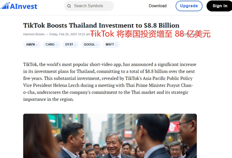 TikTok宣布在泰國(guó)投資88億美元 圖源:ainvest